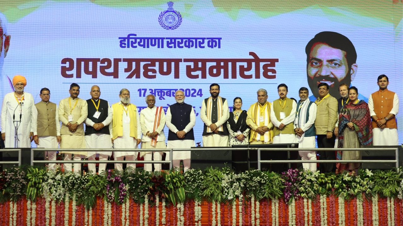 Haryana CM Oath Ceremony: भाजपा नेता नायब सिंह सैनी ने हरियाणा के मुख्यमंत्री के रूप में शपथ ले ली है. नायब सिंह सैनी की शपथ के साथ-साथ भाजपा ने तीसरी बार हरियाणा में सरकार बना ली है. हरियाणा में अब तक लगातार तीन बार कोई और पार्टी सरकार नहीं बना पाई है. पंचकुला के दशहरा मैदान में हुए कार्यक्रम में प्रधानमंत्री नरेंद्र मोदी, गृहमंत्री अमित शाह सहित कई बड़े नेता शामिल हुए.