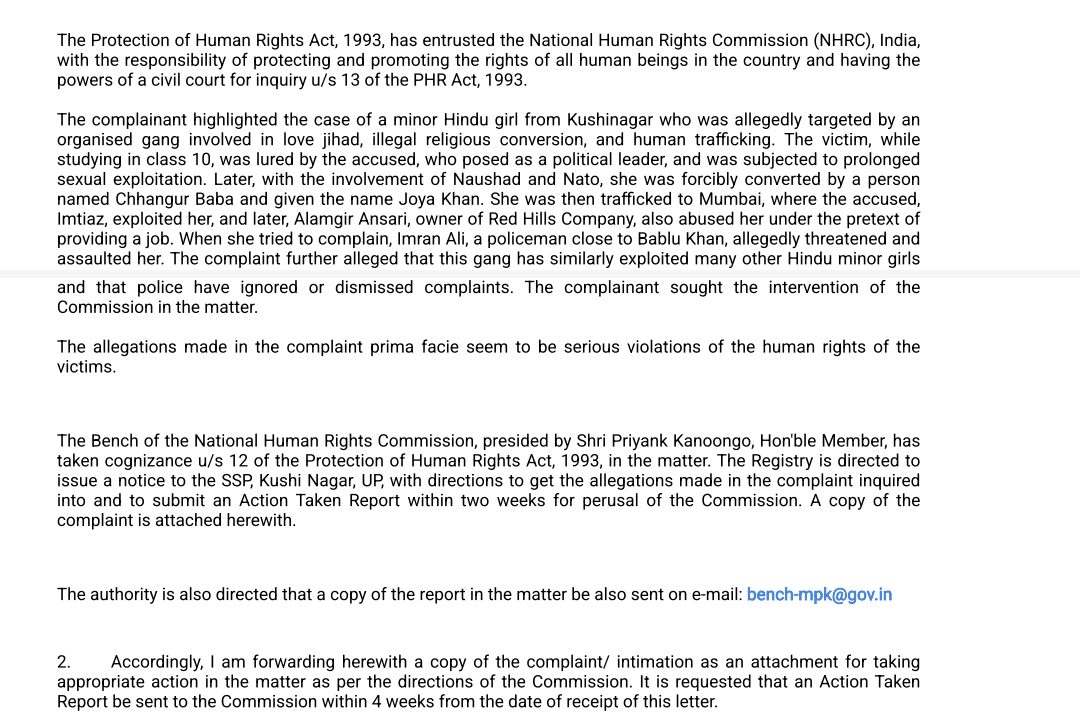 राष्ट्रीय मानवाधिकार आयोग द्वारा कुशीनगर पुलिस अधीक्षक को भेजे गये नोटिस में कहा गयाहै कि मानवाधिकार संरक्षण अधिनियम, 1993 ने राष्ट्रीय मानवाधिकार आयोग को देश के सभी मनुष्यों के अधिकारों की रक्षा और संवर्धन की ज़िम्मेदारी सौंपी है और उसे पीएचआर अधिनियम,1993 की धारा 13 के तहत जाँच के लिए सिविल कोर्ट के समान शक्तियाँ प्राप्त हैं। पत्र मे कहा गया है कि शिकायतकर्ता ने कुशीनगर की एक नाबालिग हिंदू लड़की का मामला उजागर किया है। जिसे कथित तौर पर लव जिहाद, अवैध धर्मांतरण और मानव तस्करी में शामिल एक संगठित गिरोह ने निशाना बनाया था। पीड़िता, जब दसवीं कक्षा में पढ़ रही थी, तो उसे एक राजनीतिक नेता के रूप में खुद को पेश करने वाले आरोपी ने बहकाया और लंबे समय तक उसका यौन शोषण किया। बाद में, नौशाद और नाटो की मिलीभगत से, छांगुर बाबा नाम के एक व्यक्ति ने उसका जबरन धर्म परिवर्तन कराया और उसका नाम जोया खान रख दिया। फिर उसे मुंबई ले जाया गया, जहाँ आरोपी ने उसका शोषण किया और बाद में, रेड हिल्स कंपनी के मालिक आलमगीर अंसारी ने भी नौकरी दिलाने के बहाने उसका शोषण किया। जब उसने शिकायत करने की कोशिश की, तो बबलू खान के करीबी पुलिसकर्मी इमरान अली ने कथित तौर पर उसे धमकाया और उसके साथ मारपीट की। शिकायत में आगे आरोप लगाया गया है कि इस गिरोह ने कई अन्य हिंदू नाबालिग लड़कियों का भी इसी तरह शोषण किया है और पुलिस ने शिकायतों को या तो नज़रअंदाज़ कर दिया है या खारिज कर दिया है। शिकायतकर्ता ने इस मामले में आयोग से हस्तक्षेप करने की माँग की है।शिकायत में लगाए गए आरोप प्रथम दृष्टया पीड़ितों के मानवाधिकार के उल्लंघन प्रतीत हैं। आयोग के सदस्य प्रियांक कानूनगो की अध्यक्षता वाली राष्ट्रीय मानवाधिकार आयोग की पीठ ने इस मामले में मानवाधिकार संरक्षण अधिनियम, 1993 की धारा 12 के अंतर्गत संज्ञान लिया है। रजिस्ट्री को निर्देश दिया जाता है कि वह वरिष्ठ पुलिस अधीक्षक, कुशीनगर, उत्तर प्रदेश को नोटिस जारी करके शिकायत में लगाए गए आरोपों की जाँच करवाएँ और आयोग के अवलोकनार्थ दो सप्ताह के भीतर कार्रवाई रिपोर्ट प्रस्तुत करें।