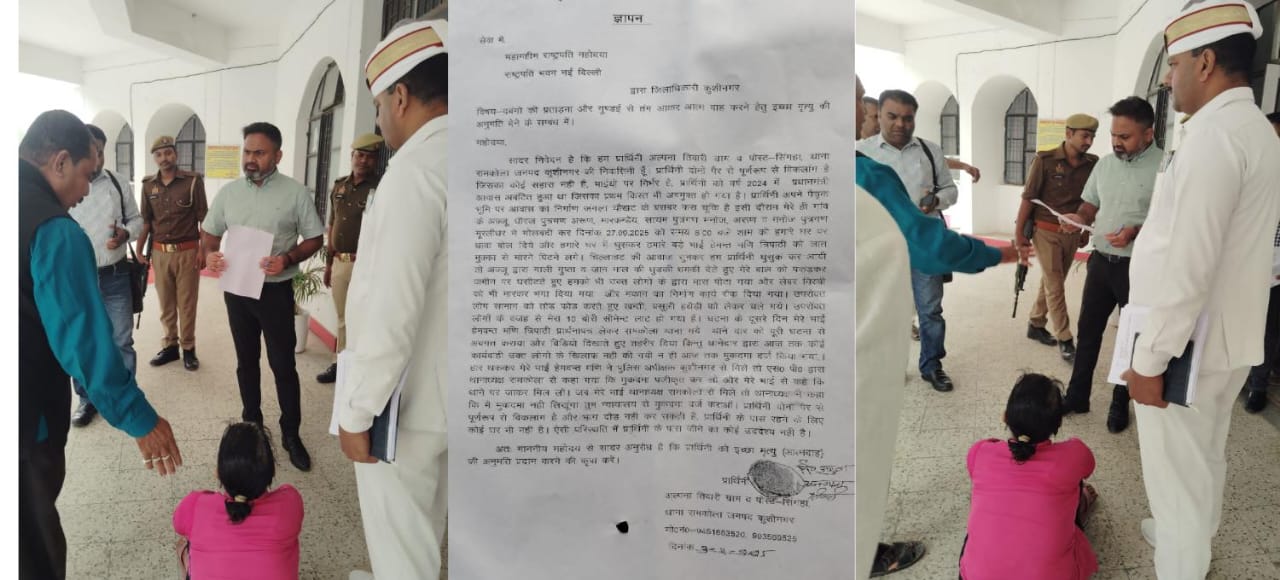 कुशीनगर। गांव के दबंगों द्वारा विकलांग महिला को प्रधानमंत्री आवास निर्माण कराने से रोकने व बार बार प्रताड़ित किये जाने के मामले मे विकलांग पीडिता ने राष्ट्रपति को संबोधित जिलाधिकारी को ज्ञापन देकर इच्छामृत्युकी अनुमति मांगी है। जिलाधिकारी ने मामले को गंभीरता से लेते पीडिता को न्याय दिलाने का भरोसा जताया है।